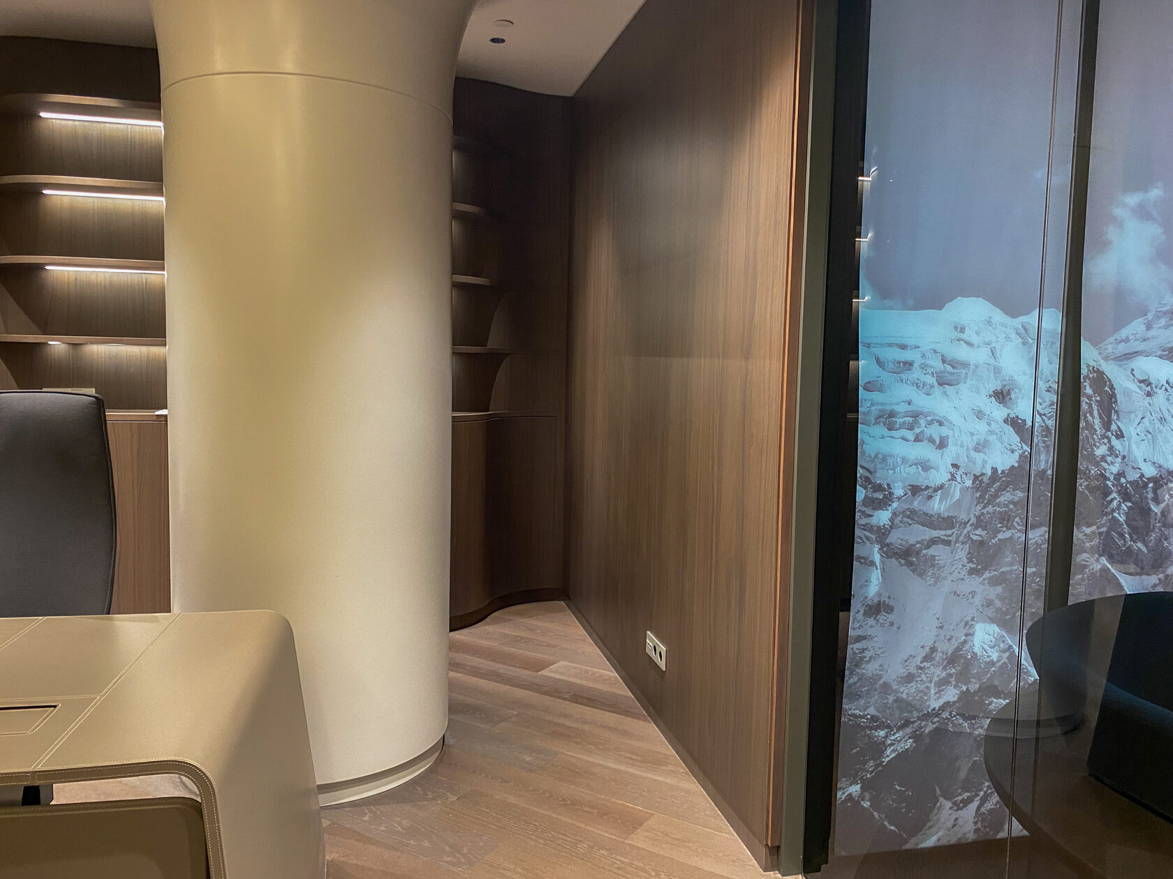 Материалы – шпон американского ореха, тонированный под образец заказчика -стеновые панели и двери; МДФ эмаль под RAL 9003 – потолочные панели; шпон ясеня, тонированный под образец заказчика – Шкафы, стойки ресепшн, кабинеты. Фурнитура – BLUM.