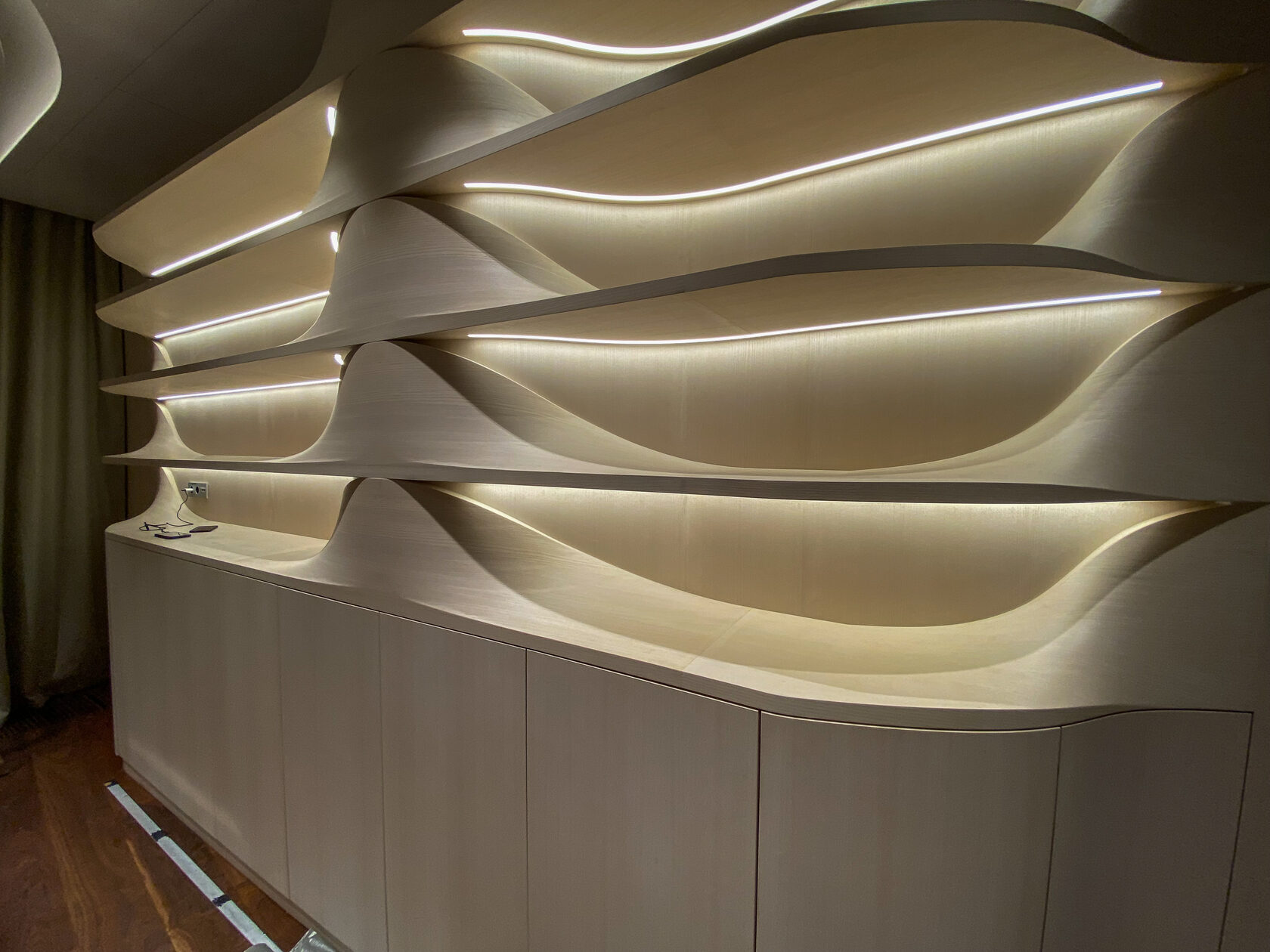 1) Материалы – шпон американского ореха, тонированный под образец заказчика -стеновые панели и двери; МДФ эмаль под RAL 9003 – потолочные панели; шпон ясеня, тонированный под образец заказчика – Шкафы, стойки ресепшн, кабинеты. Фурнитура – BLUM.